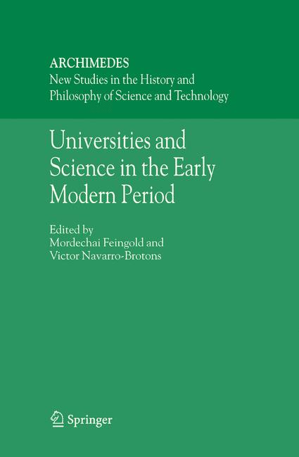 Grazina Rozinska, 'Mathematics for Astronomy' at the Universities in the Era of Copernicus: Modern Attitudes toward Ancient Problems Jose Chabas, The University of Salamanca and the Renaissance of Astronomy during the Second half of the Fifteenth Century Luis Garcia Ballester, Medical Science and Medical Teaching at the University of Salamanca in the Fifteenth Century Jose M. Lopez Pinero, The Faculty of Medicine of Valencia: Its Position in Renaissance Europe Victor Navarro-Brotons, The cultivation of astronomy in Spanish universities in the latter half of the 16th century Roger Ariew, The Sphere of Jacques du Chevreul: Astronomy at the University of Paris in the 1620s Maija Kallinen, Lectures and Practices: The Variety of Mathematical and Mechanical Teaching at the University of Uppsala in the Seventeenth century Maria Teresa Borgato, Mathematical Research in Early Modern Italian Universities Luigi Pepe, Universities, Academies and Sciences in Early Modern Italy Luis Miguel Carolino and Henrique Leitao, Natural Philosophy and Mathematics in Portuguese Universities, 1550-1650 Piero del Negro, Venetian Policy toward the University of Padua and Scientific Progress during the Eighteenth Century Paul Wood, Candide in Caledonia: The Culture of Science in the Scottish Universities, 1690-1805 Ugo Baldini, The Sciences at the University of Rome in the Eighteenth Century Jose Luis Peset, Enlightenment and Renovation in the Spanish University Antonio Garcia Belmar and Jose Ramon Bertomeu Sanchez, Chemistry Textbooks and the Teaching of Chemistry in Late Eighteenth-Century Spain: Building a New Genre of Scientific Literature Cristina Sendra-Mocholi, Botany in University Studies in thelate 18th Century. The Case of Valencia University Agusti Nieto-Galan and Antoni Roca-Rosell, Scientific Education and the Crisis of the University in Eighteenth-Century Barcelona Luis Carlos Arboleda Aparicio and Diana Soto Arango, The Theories of Copernicus and Newton in the Viceroyship of Nueva Granada and the Audiencia de Caracas during the Eighteenth Century
